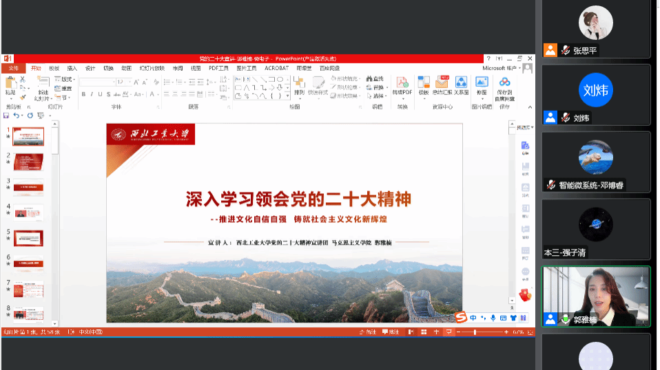 宣讲从党的二十大的重要意义开始讲起,带领我们明确二十大的主题、主要成果,重温过去五年的工作和新时代十年伟大变革,感悟马克思主义中国化时代化,体会中国式现代化,引导师生党员认识到高度重视文化建设的意义,了解新时代文化建设的总要求及具体举措,启发广大师生党员更具责任感与使命感。