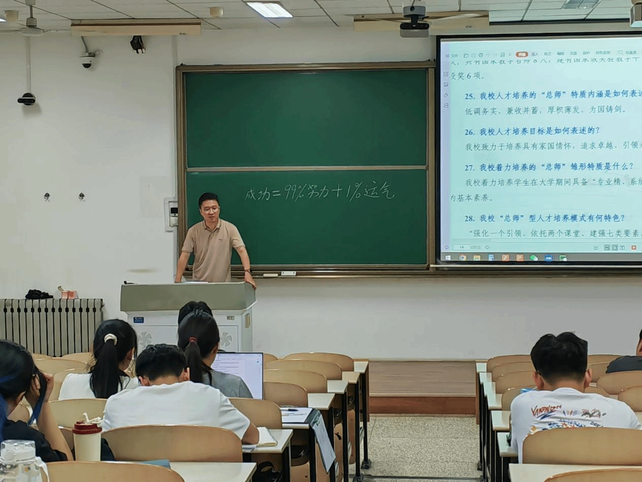课程开始,余鹏详细讲述了“总师”特质的内涵、与之相匹配的人才培养目标,以及“总师型人才”应具备的核心能力素养,希望同学们以此为目标,不断提升自身核心竞争力。随后,余鹏结合成长成才规律,阐释了“成功=99%努力+1%运气”的逻辑和内涵,鼓励同学们要在学习生活中珍惜时光、持续努力、夯实基础、拓展眼界,以及善于创造和抓住各种机会。课程最后,余鹏带领同学们观看了上届学校大学生优秀标兵和模范班级的精彩答辩,为同学们的发展树立了榜样。
