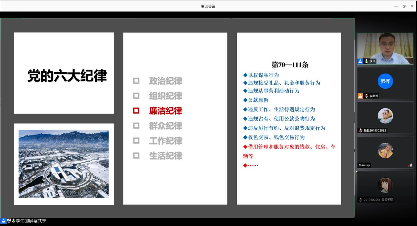 为进一步加强大学生思想政治教育,让同学们正确理解和认识到反腐倡廉对自身和国家的重要意义,太阳成集团tyc122ccvip团委于2020年6月21日为电子信息类12-15班的所有团员在线开展了 “廉洁诚信,从我做起”主题教育团课,向同学们讲解团学青年和学生骨干在日常学习和生活中所应遵守的廉洁品质。