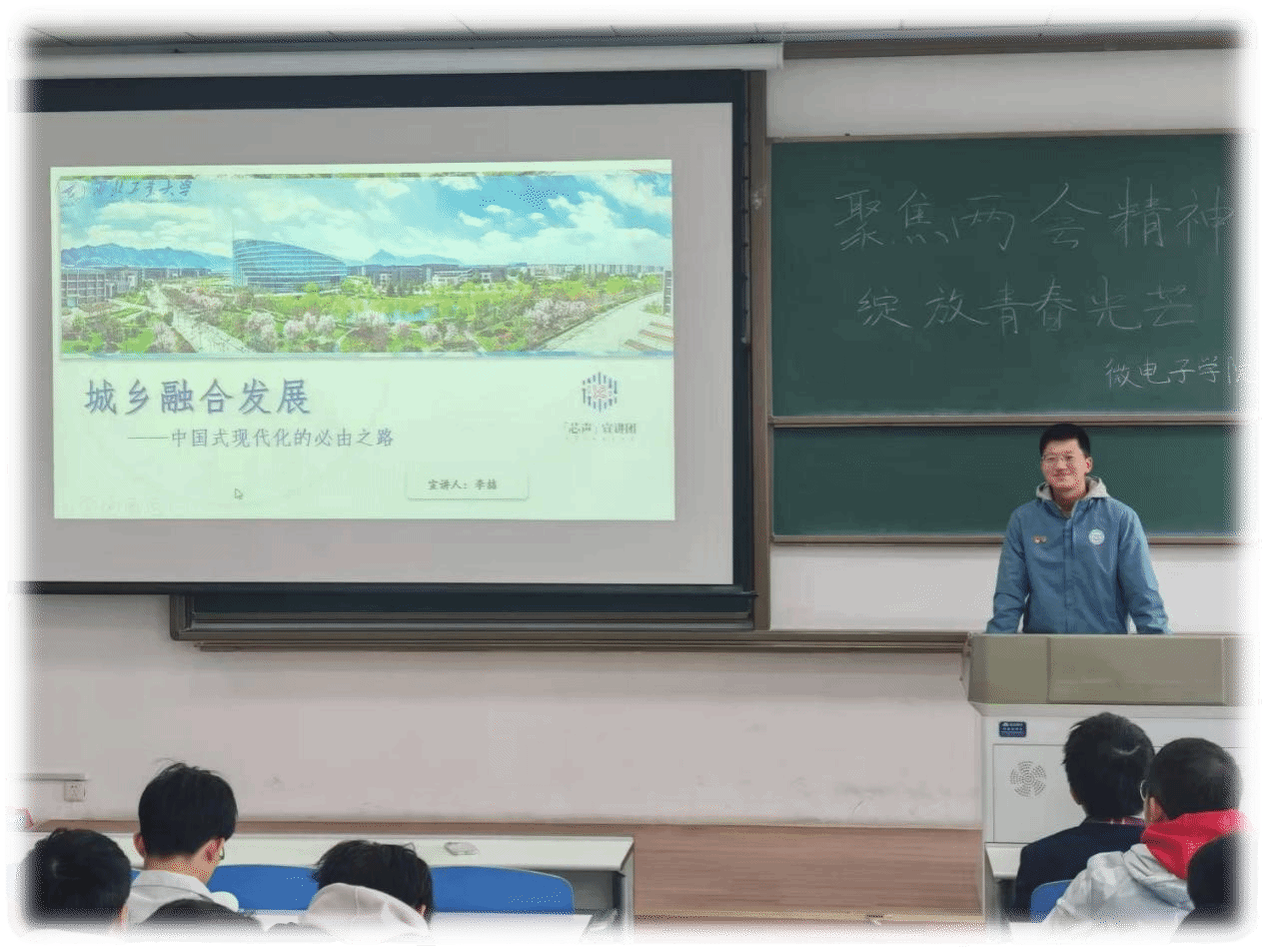 图2  周墨涵为同学们介绍两会         图3  李喆宣讲城乡融合发展