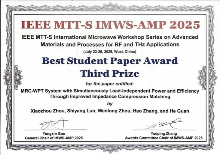 2025年7月23至26日,江苏省产业技术研究院和香港城市大学青岛研究院主办的国际微波系列研讨会(IEEE MTT-S International Microwave Workshop Series on Advanced Materials and Processes for RF and THz Applications)在江苏省无锡市成功召开。经过评审,会议最终评选出来自悉尼大学、上海交通大学、东南大学、电子科技大学和西北工业大学的6篇会议论文当选最佳学生论文奖,其中一等奖1名、二等奖2名、三等奖3名,西北工业大学太阳成集团tyc122ccvip2023级硕士研究生周小舟凭借氮化镓高频磁谐振无线传能系统相关研究获得三等奖,指导教师为学院张浩副教授。